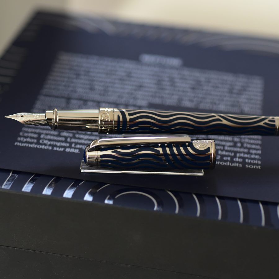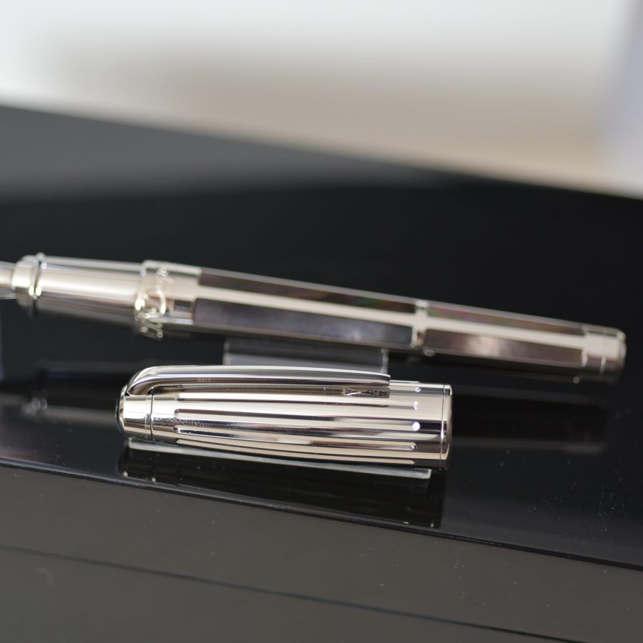 Esta estilográfica Olympio está decorada con doce incrustaciones de nácar negro, que brilla con reflejos iridiscentes.