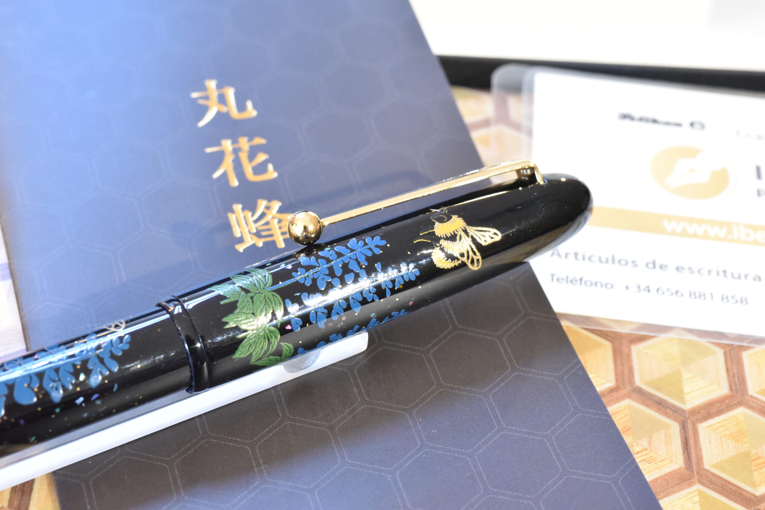 La pluma está exquisitamente decorada con la representación de abejorros recolectando néctar, empleando la técnica Hira Maki-e (Maki-e Plano) para capturar el polen que adorna sus alas y cuerpo. La imagen de abejorros revoloteando alrededor de salvias azules utiliza una combinación de Togidashi Maki-e (Maki-e Bruñido), Raden (Nácar) y polvo de oro para transmitir movimiento y luz.